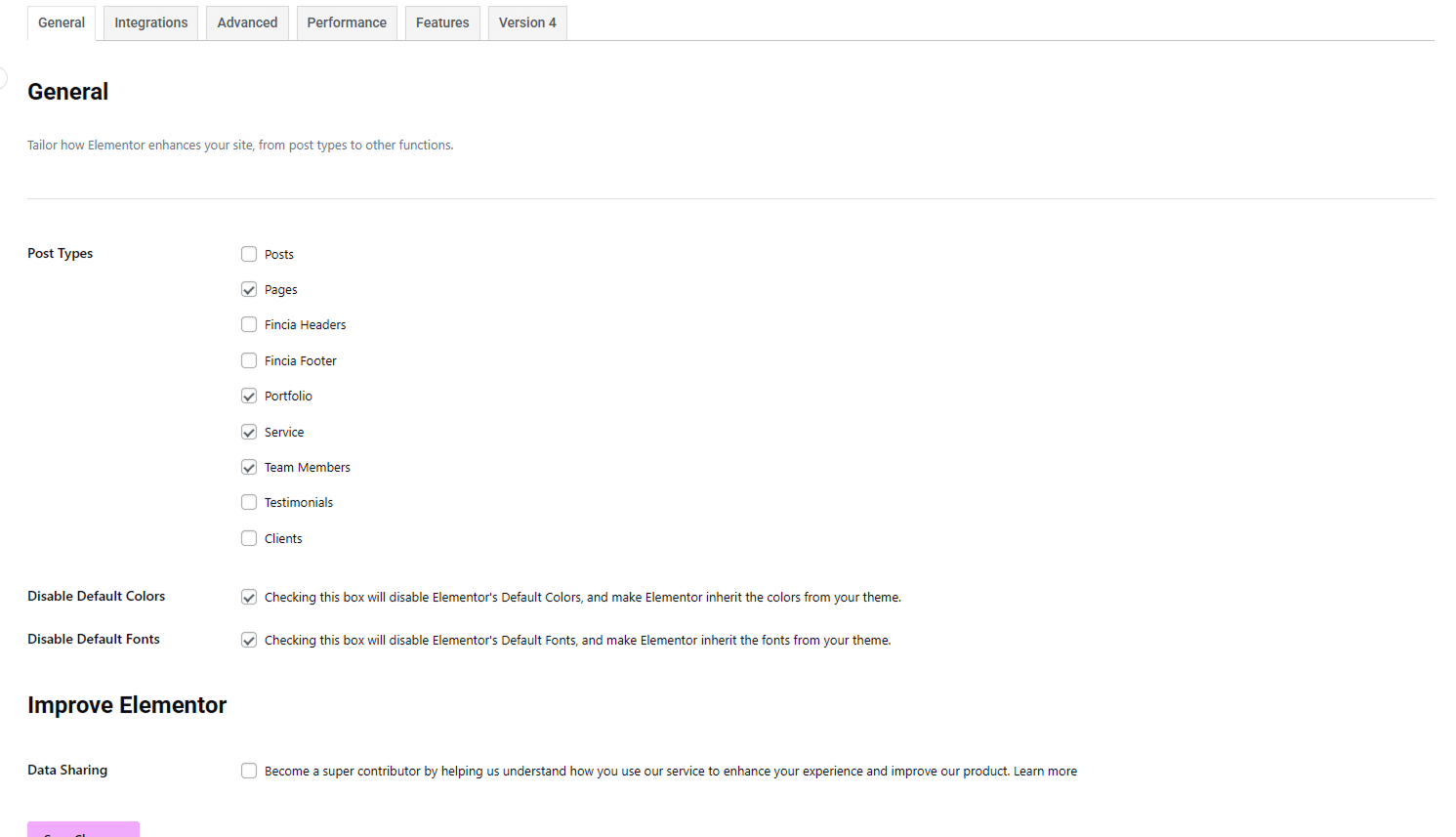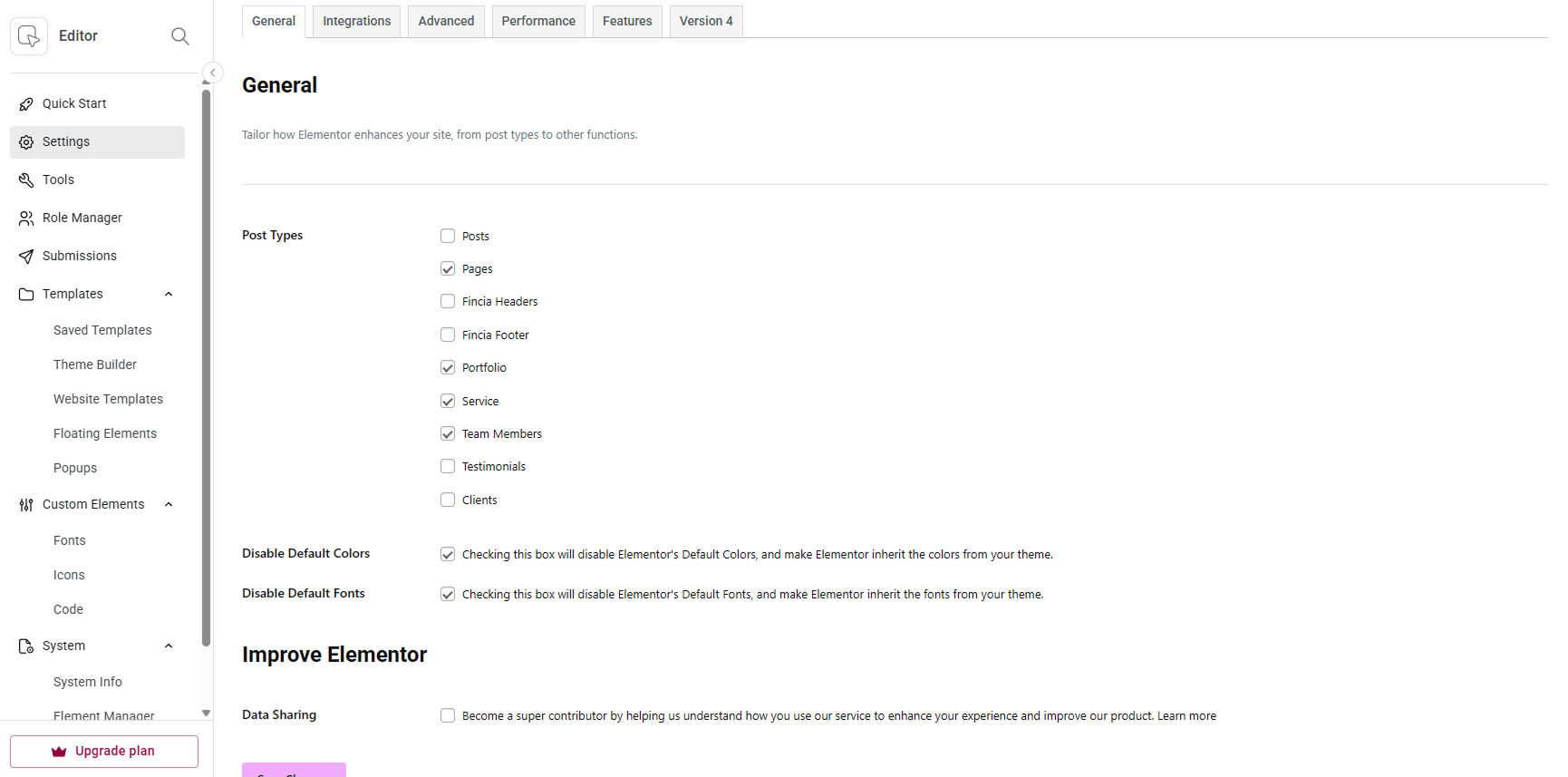 With Fincia, you can fully customize your headers and footers using Elementor. To do this, you first need to enable Fincia custom post types in Elementor settings.