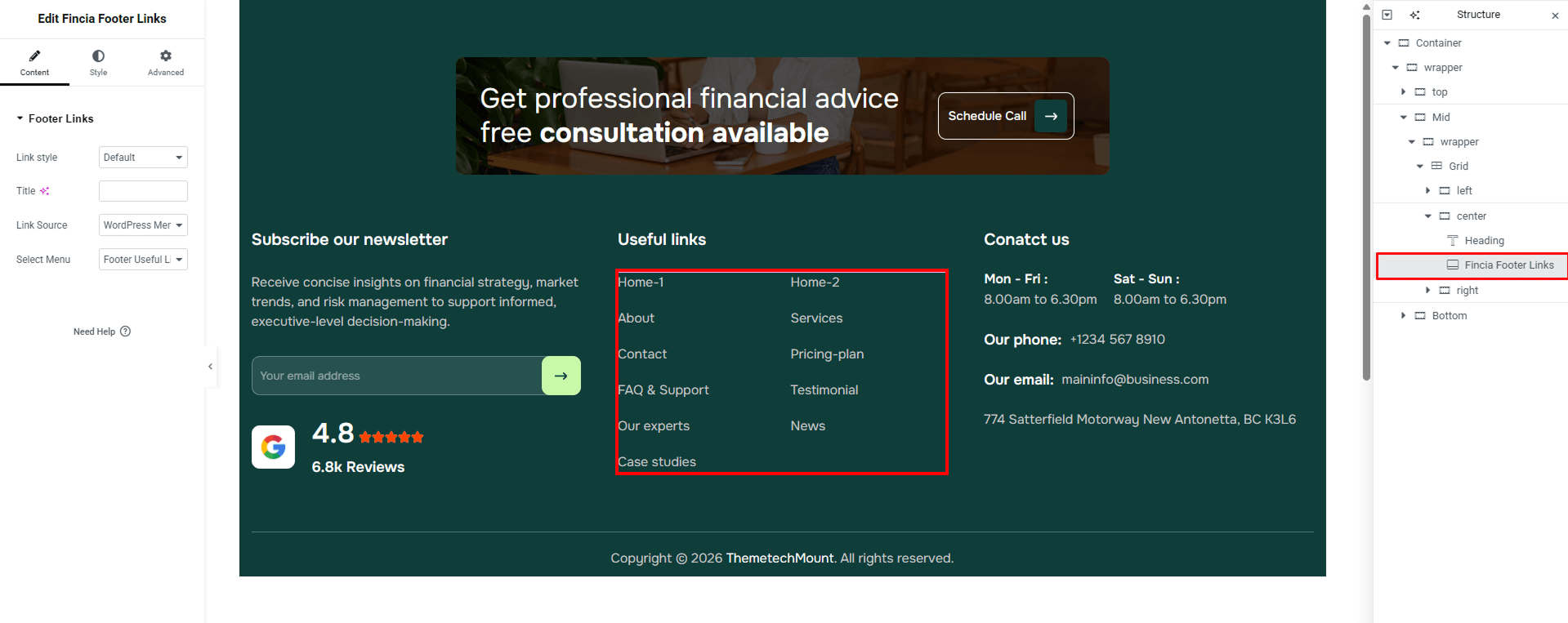 From the Fincia Footer section in your WordPress Dashboard, you can manage and customize available footer layouts.