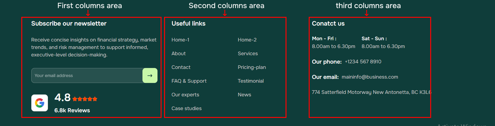 You can also change the column view of the Footer widgets. Just go to Admin > Fincia Options > Footer Settings section and change the "Select Footer Column layout View" option: