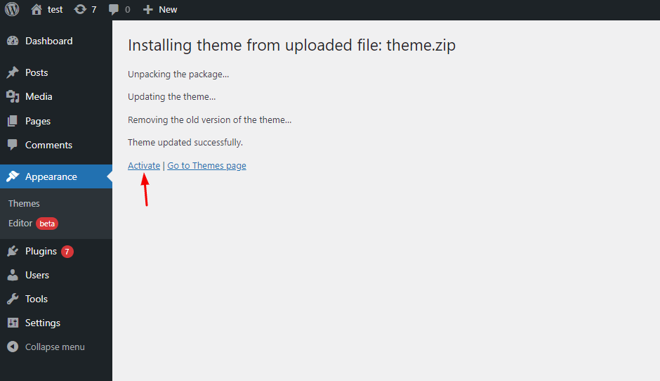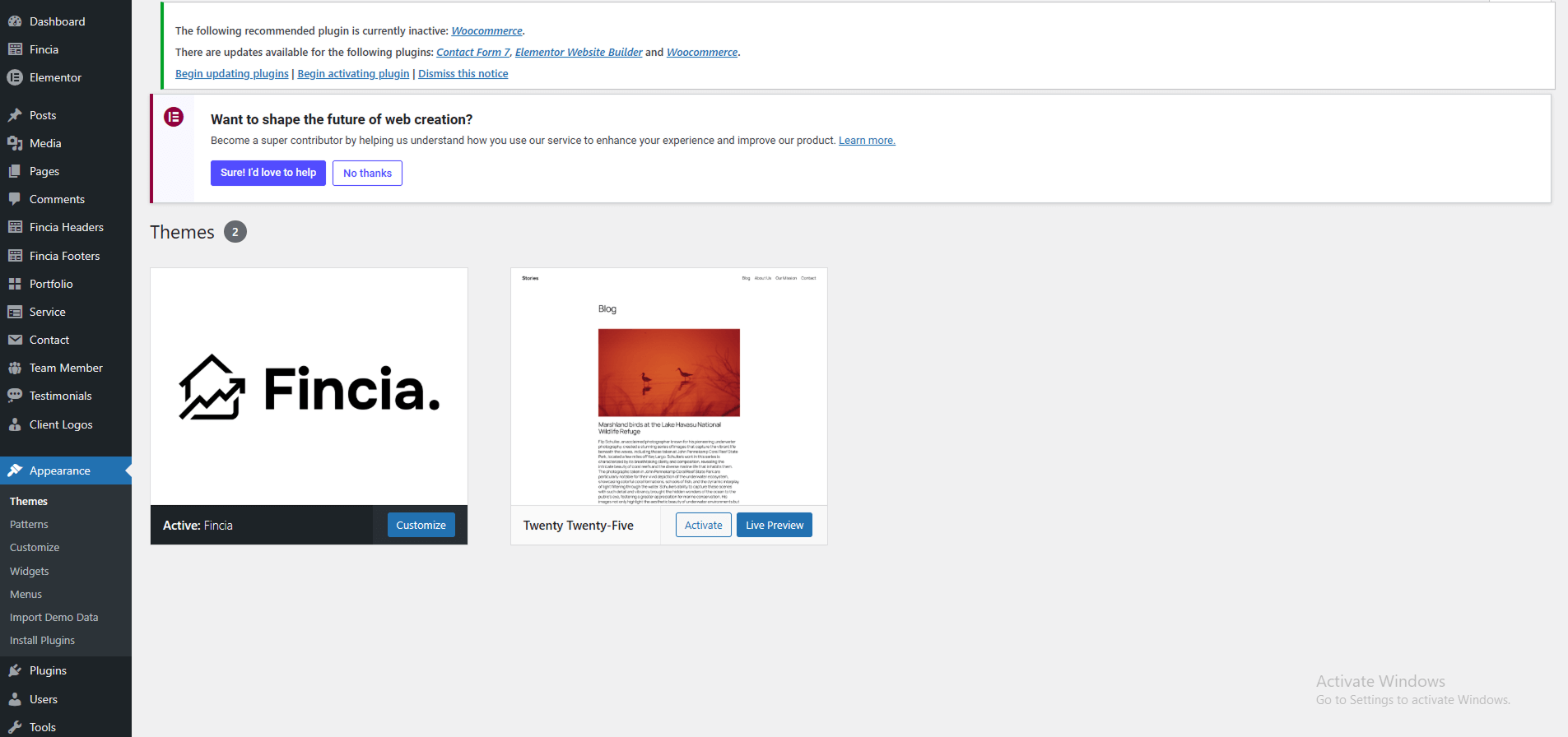 Once uploaded, activate the theme by heading to the “Themes” menu in the WordPress Dashboard. Locate the Fincia Theme and hit “Activate”.
