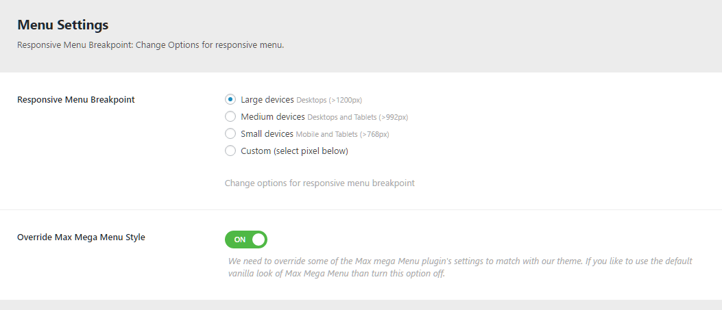 You can manage menu and sub-menu (dropdown menu) settings from here. You can also change Responsive Menu Breakpoint from here (from which display size the menu will become single icon mode). You can change Font-family, font-size, font-color, background-color etc properties for both main-menu and sub-menu both.