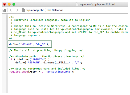 Step 3 – Define the WPLANG constructor by adding the ISO Language code of your language. The names consist of locals, a combination of language and regional dialect. For example, if you were translating to Deutsch language, change the WPLANG constant to look like the following code: